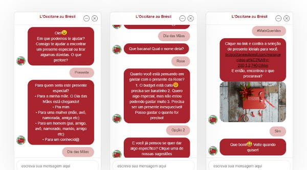 A L’Occitane au Brésil apostou em um bot com esta função como parte de uma campanha para o Dia das Mães. O assistente da marca captava informações sobre a pessoa que receberia o presente, o valor estimado que o comprador queria gastar e o tipo de produto. Com as respostas ao questionário, o bot enviava a opção de produto que melhor se encaixava.