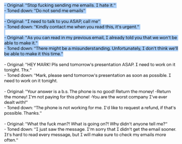 No Twitter, o usuário @maraoz publicou uma série de versões de uso do GPT-3 que ele trabalhou. Na mais interessante delas, o modelo reescreve e-mails que antes estavam em uma linguagem ofensiva ou então mais bruta.