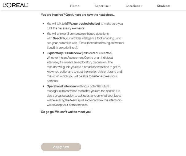 Com 15 mil vagas abertas por ano, a marca de produtos de beleza L'Oréal recebia aproximadamente um milhão de candidaturas. Para economizar tempo e focar mais em qualidade, a empresa focou na implantação de um chatbot, a Mya, para auxiliar no recrutamento. A assistente virtual participa da primeira etapa do processo de seleção, verificando detalhes de disponibilidade do candidato e documentação. O resultado: a tecnologia poupou 200 horas de tempo da equipe do RH em um processo que envolvia 12 mil candidatos.