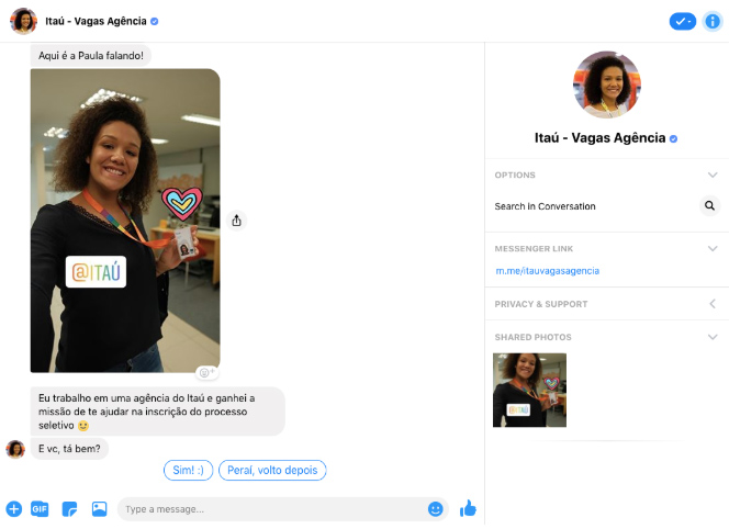 No banco Itaú, a assistente virtual Paula auxilia nos processos de recrutamento através de uma página no Facebook, direcionando os candidatos para as vagas com os perfis que mais se encaixam com suas experiências, também faz algumas perguntas-chave para entender se a pessoa tem fit com os valores da empresa. Com um posicionamento descontraído, o bot envia memes e outros recursos típicos do digital durante a interação.
