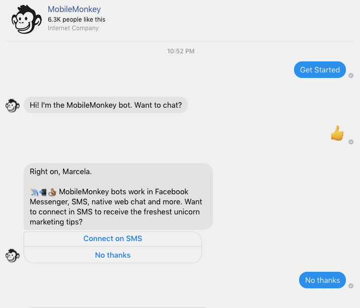 A empresa MobileMonkey implantou um bot homônimo para atender os usuários no Facebook. Esse assistente tem uma abordagem engraçadinha e usa bastante emojis na comunicação.