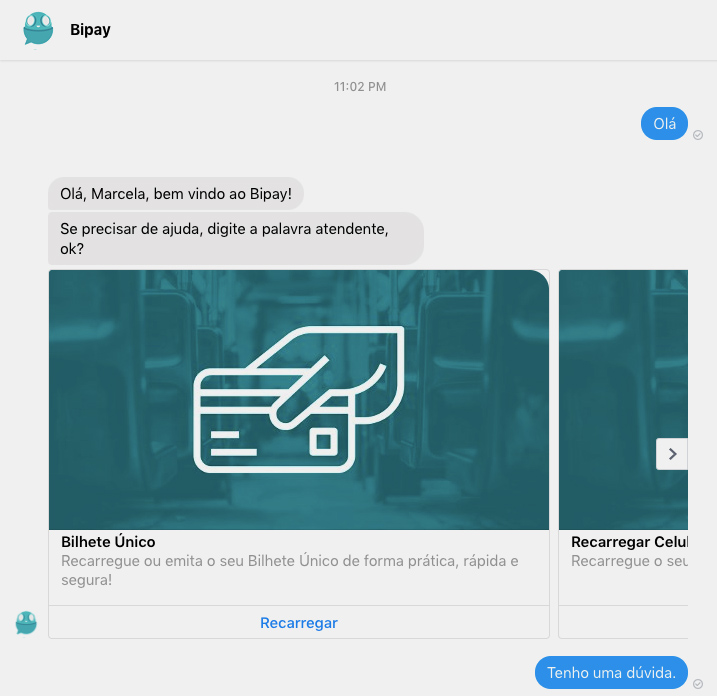O Bipay é um bot que ajuda os usuários a carregar o cartão de transporte. Este assistente virtual assume uma personalidade robótica, que fica visível por meio do avatar: um robozinho fofo e amigável.